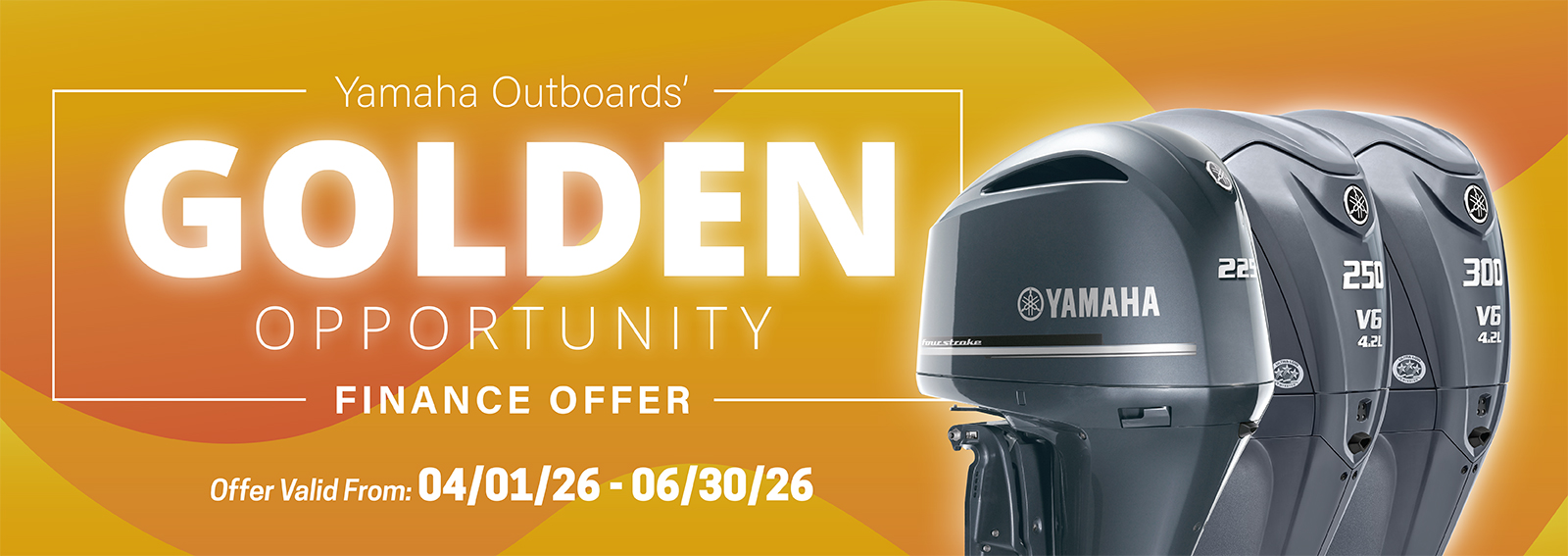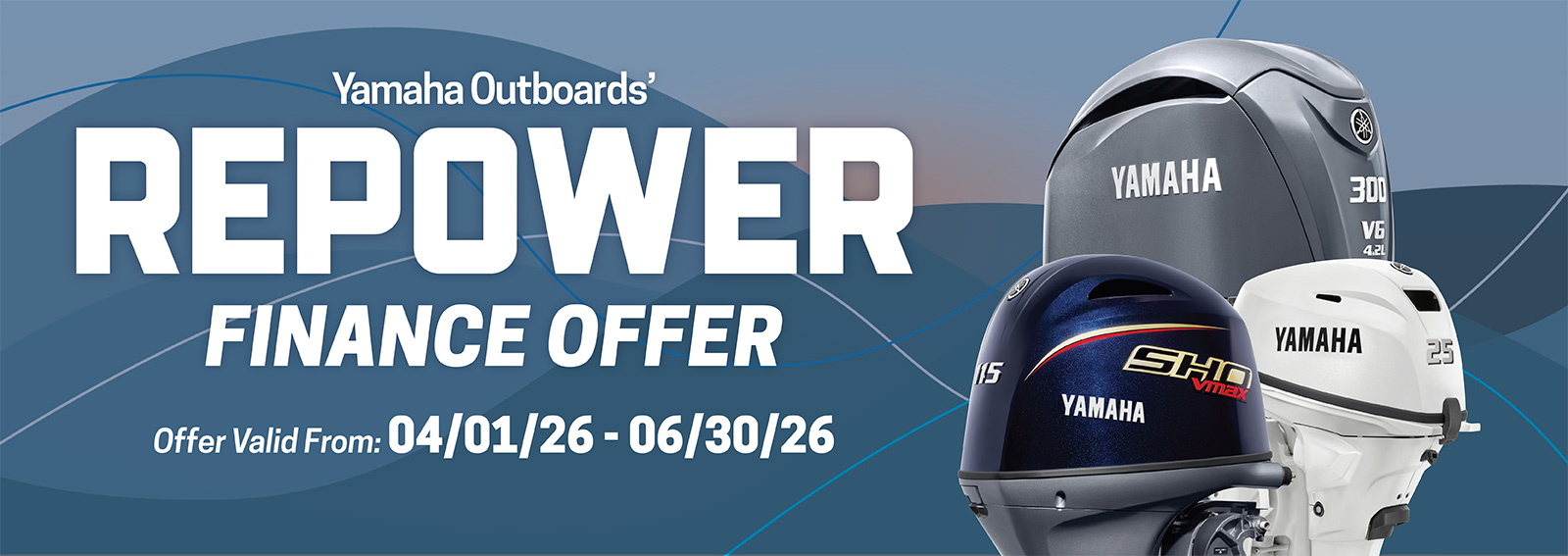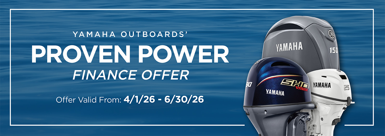 *PROGRAM TERMS AND CONDITIONS: *INSTALLMENT OFFER: *Available for well qualified tier 1 credit customers who finance through Yamaha Motor Finance Corporation, U.S.A. Offer valid 4/1/2026 – 6/30/2026. 3.99% APR financing for 72 months at $14.97 per month per $1,000 financed based on pricing of 100% LTV. Must take delivery from retail stock by 6/30/2026 on purchases of new (unused and not previously warranty registered) Yamaha Outboard Motor manufactured since January 2019. Available on approved credit through Yamaha Financial Services. Promotional rates are based on creditworthiness. Not all buyers will qualify. Higher financing rates apply for buyers with lower credit ratings. **CARD OFFER: *Available on approved purchases of new (unused and not previously warranty registered) Yamaha Outboard Motor manufactured since January 2019 made on the Yamaha Credit Card issued by WebBank. Offer valid 4/1/2026 – 6/30/2026. Account must be open and current to be eligible for this offer. Introductory 2.99%, 4.99%, 6.99%, 14.99% APR financing with minimum payments of 1.25%, 1.42%, 1.58%, 2.25% of the purchase price balance are effective for initial 36 months based on creditworthiness. After the 36-month introductory period, standard APR 15.99%, 18.99%, 20.99%, 23.99% based on creditworthiness with minimum monthly payments shall be due equal to the greater of 1% of existing balance plus standard interest charges, late fees and late payment amounts, or $25 until the purchase price is paid in full. Minimum interest charge $2 per month. Promotional rates are based on creditworthiness. Not all applicants will qualify.
