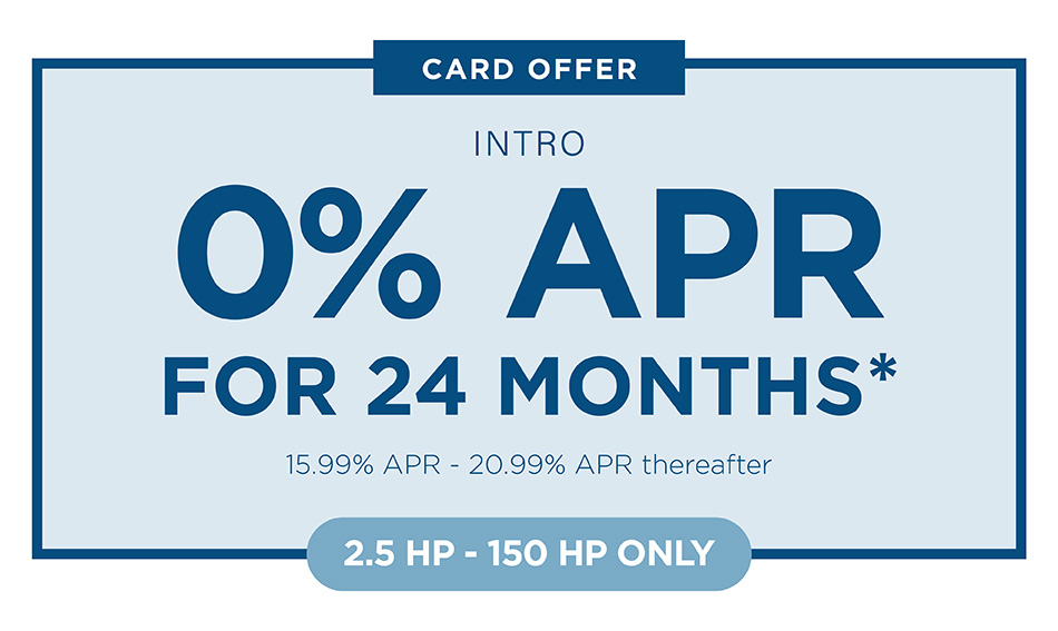 *PROGRAM TERMS AND CONDITIONS: *Available on approved purchases of new (unused and not previously warranty registered) Yamaha Outboard Motor manufactured since January 2019 for 2.5 HP to 150 HP Yamaha outboard motors only made on the Yamaha Credit Card issued by WebBank. Offer valid 4/1/2026 – 6/30/2026. Account must be open and current to be eligible for this offer. Introductory 0% APR for tier 1 - 3 financing with minimum payments of 1.00% of the purchase price balance are effective for initial 24 months based on creditworthiness. After the 24-month introductory period, standard APR 15.99%, 18.99% or 20.99% based on creditworthiness with minimum monthly payments shall be due equal to the greater of 1% of existing balance plus standard interest charges, late fees and late payment amounts, or $25 until the purchase price is paid in full. Minimum interest charge $2 per month. Promotional rates are based on creditworthiness. Not all applicants will qualify.