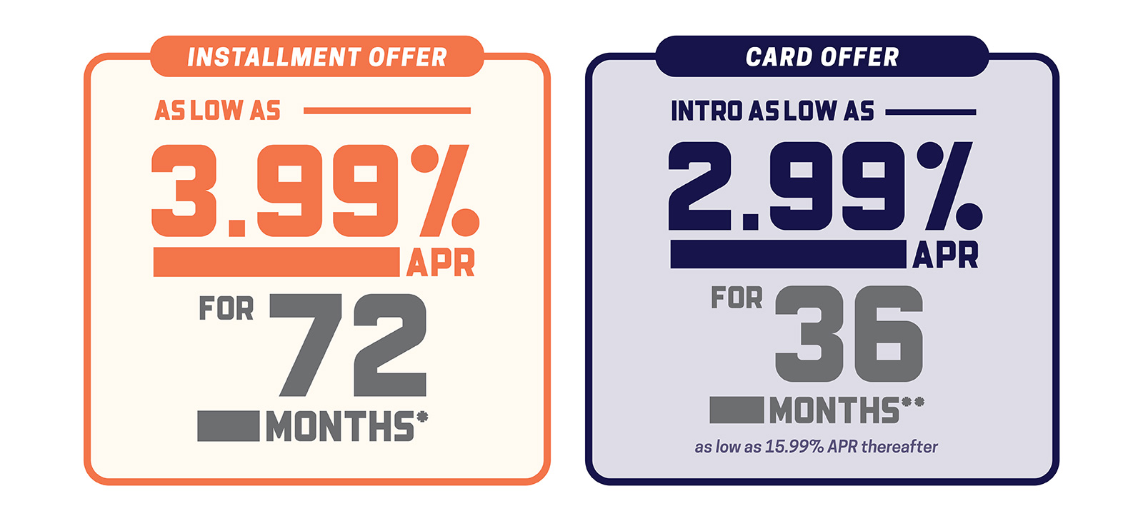 INTRO AS LOW AS 3.99% APR FOR 24 MONTHS, AS LOW AS 15.99% APR THEREAFTER3